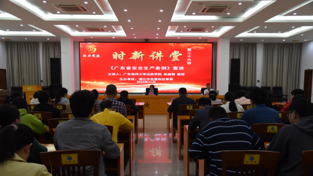 为深入学习宣传贯彻新修订的《广东省安全生产条例》(以下简称《条例》),营造安全生产学法、守法、用法的浓厚氛围,11月15日,市发展改革局“时新讲堂”第二十六讲特邀请广东海洋大学法政学院教授张继钢开展《广东省安全生产条例》专题培训。党组成员、副局长岑丹红主持并作总结,全局干部职工参加本次讲座。