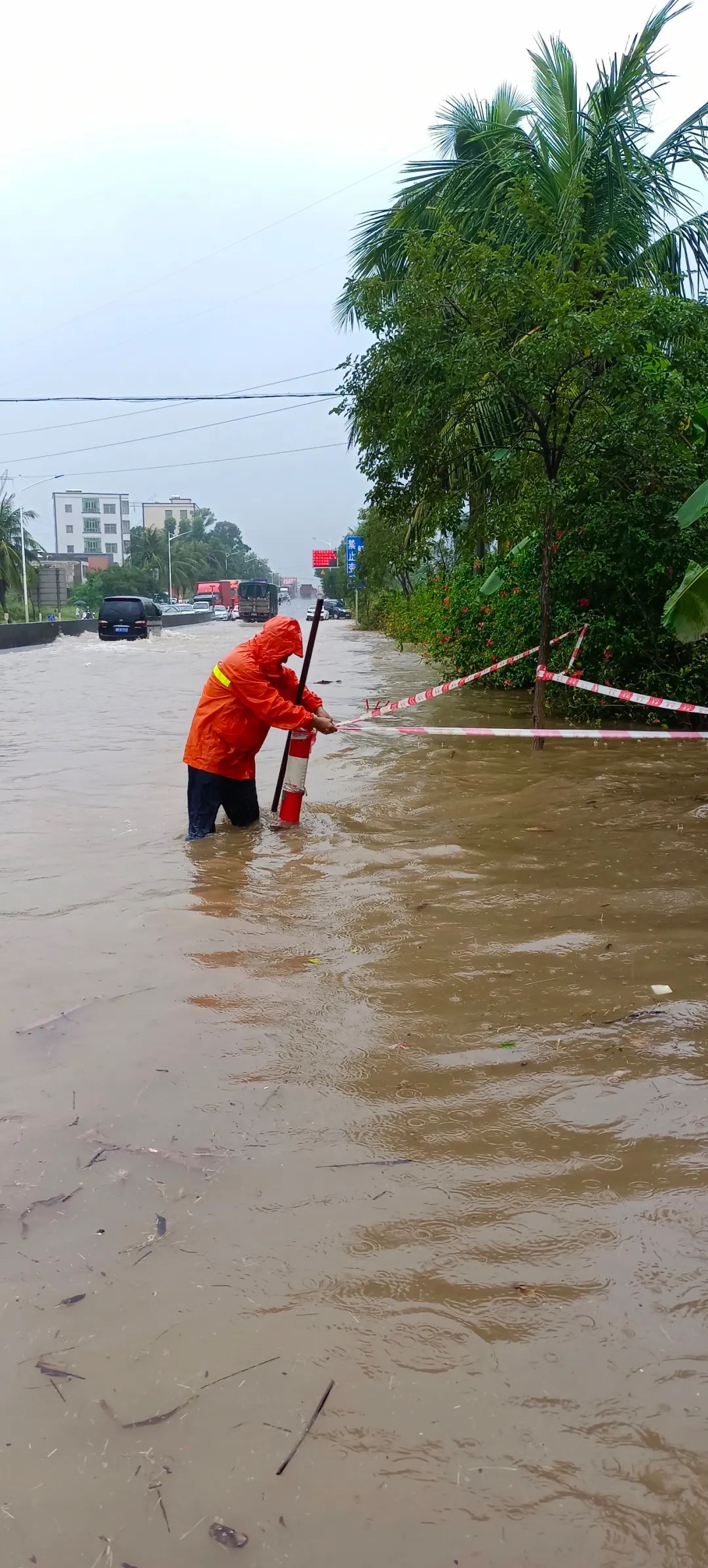 各养护所加强辖区公路的巡查力度和频度,发现险情及时告知养护人员加快处理,养护所全体人员冒雨抢险,与时间赛跑,争分夺秒保畅公路。8时30分,国道228线K6501+950(麻章区南亚湛江大道跨线桥底)处积水严重,跨线桥处积水路段长度约200米,积水深度达80厘米,过往汽车随时都有抛锚的可能。麻章养护所当即出动7人迅速疏通排水,路面积水已于下午2时左右排干净。10时30分,国道228线K6482+850官渡段水浸严重,积水深达半米,过往车辆艰难行驶,坡头养护人员紧急疏通各排水口的堵塞物后,又立即配合交警指挥现场交通,下午4时40分,积水渐渐消退后,路面恢复正常通行。下午3时,省道 293线K121+000-K121+700米处的护坡发生大面积泥流,严重影响交通安全,东海养护人员立即出动应急外挖机及时清理水毁路段。在排险期间,养护人员主动帮助群众推动因积水而无法前行的车辆,切实保护人民财产安全,获得了群众的好评。