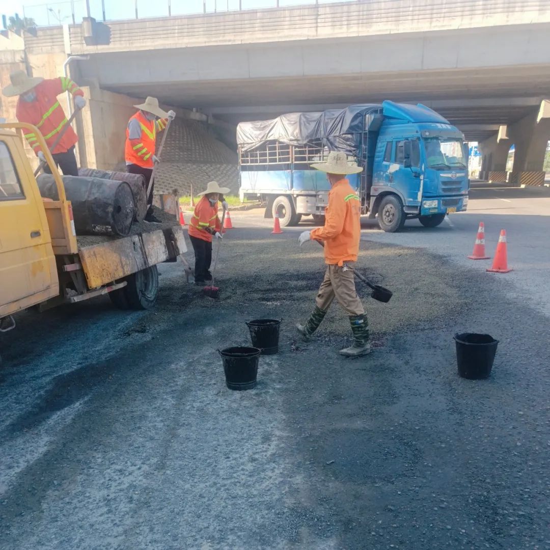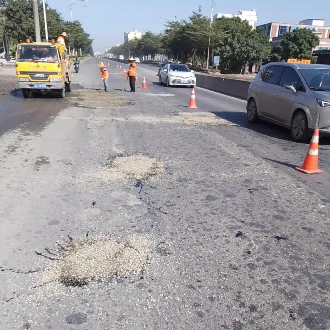 麻章养护所备好石粉、沥青等修补材料后,便马不停蹄地前往病害路段,根据车流量信息,选择错峰施工,流动作业。为了有效保障施工作业质量,修补过程中,技术人员进行专业技术指导,根据坑槽破损情况,现场划定开槽面积,确定坑槽深度,严格执行“一坑一方案”,保证施工质量。他们将沥青均匀地浇筑进清理好的路面坑槽,再将石粉一铲一铲地填补进去,最后自行碾压和行车碾压互相配合,提高了路面的平整度,确保之后行车过程中不会出现跳车的情况。