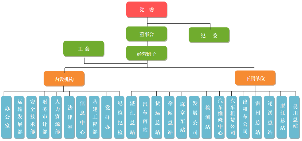 湛汽集团是一家集班车客运、包车客运、旅游客运、汽车租赁、出租车、旅行社、汽车维修和机动车检测等多种业务于一身的综合性道路运输企业;企业内设机构10个,属下15家子公司,总资产5.61亿元,负债总额3.33亿元;员工约3127人,其中在岗职工1244人,离退休人员1883多人;三级以上等级汽车客运站场6个,涵盖了湛江市所有县市区;拥有道路客运线路186条、营运车辆800多辆,具备经营一类客运班线资格,运输线路覆盖粤、桂、琼等省市县;公司具有较强的经济实力和团队管理能力,拥有一支专业的管理队伍,经营管理经验丰富。