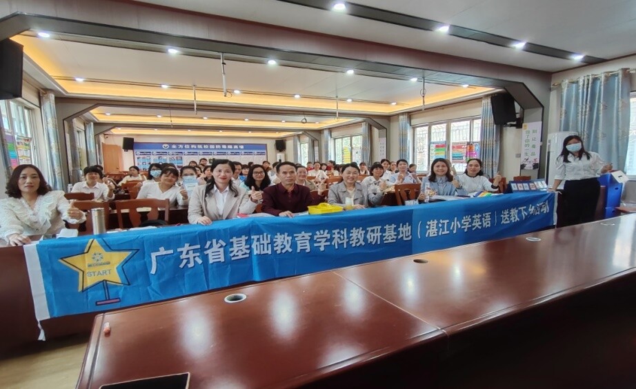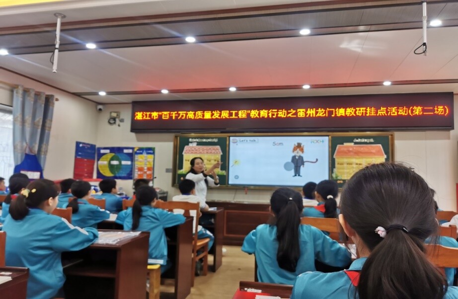 廉江市城北街道中心学校文江丽老师进行课例PEP四年级上册U6 Let’s spell a e i o u的展示;廉江市教师发展中心阮晓晖老师结合文江丽老师的课例进行《多技术融合的小学英语语音教学策略》专题讲座:雷州市驻点龙门镇中心小学挂职副校长陈秋燕就龙门镇小学英语及其它学科的教研工作做了交流和布置。广东省基础教育学科教研基地(湛江小学英语)项目组为龙门镇中心小学、龙门镇第二小学、龙门镇德地小学各增送了一套小学英语评价手册和部分语音教学教具、电子教鞭。