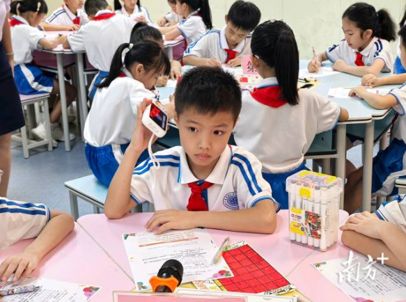 “在第一课时,我们开展了‘寻秋之旅’,使用拍学机拍摄校园里的桂花、银杏、石榴等景物,并通过AI特效一键生成日历插画与边框。”上课铃声响起,湛江市第八小学副校长陈华晓手持噜咔博士AI拍学机说道,“今天,我们将请它帮助我们做好国庆节的规划。”陈华晓现场演示了如何通过语音与设备交互并获取知识讲解。