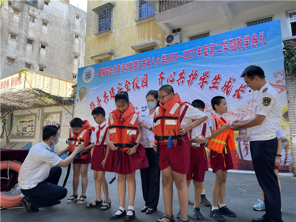 7月9日,市八小开展“携手共建安全校园 齐心共护学生成长”暑假安全教育活动(如图,记者 林石湛 摄)。据悉,此次活动由区教育局、湛江海事局、团赤坎区委联合发起,当天,各主办单位签订了“水上安全知识教育”共建协议,湛江海事局与市八小等8所学校签订“海事学校”共建协议。