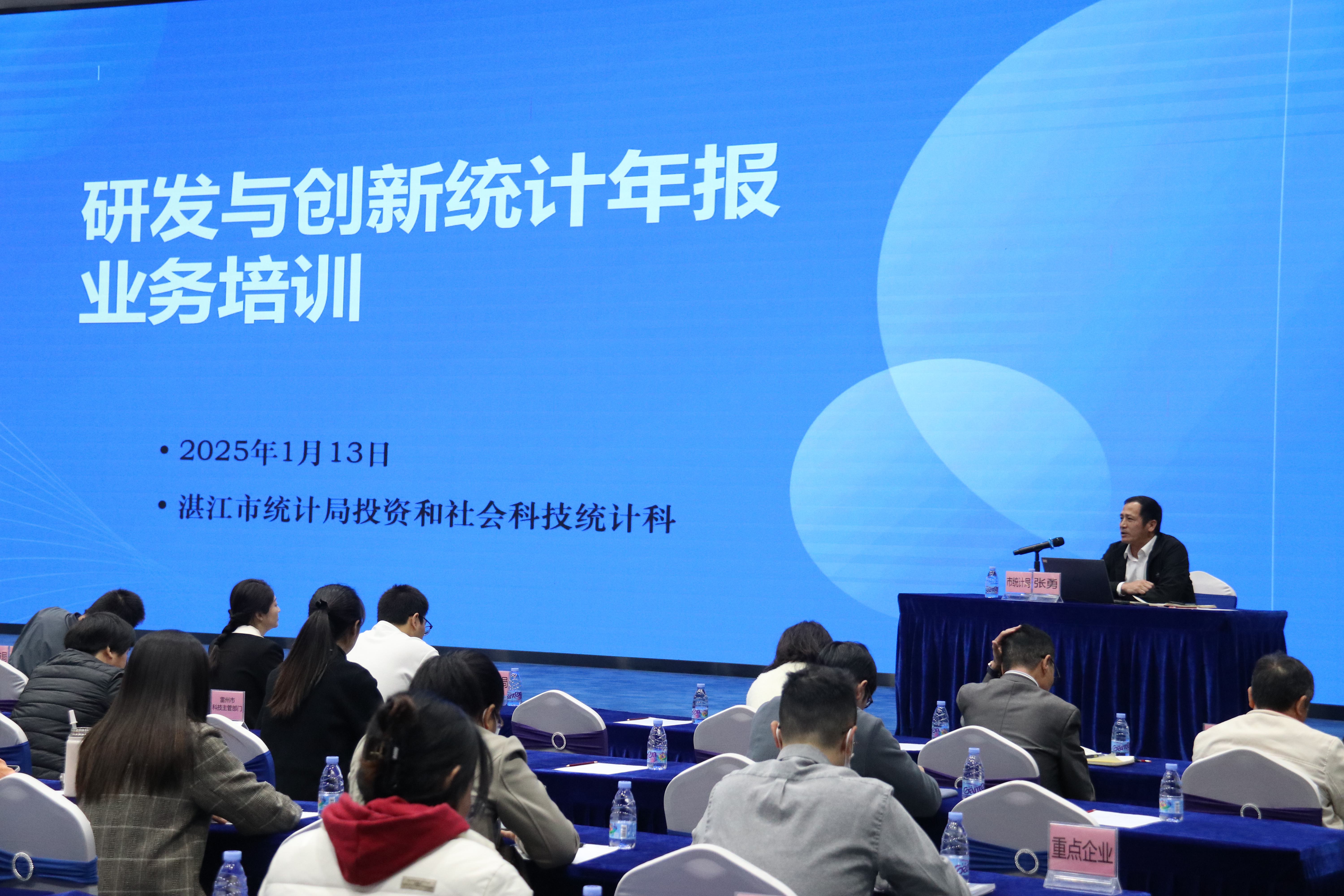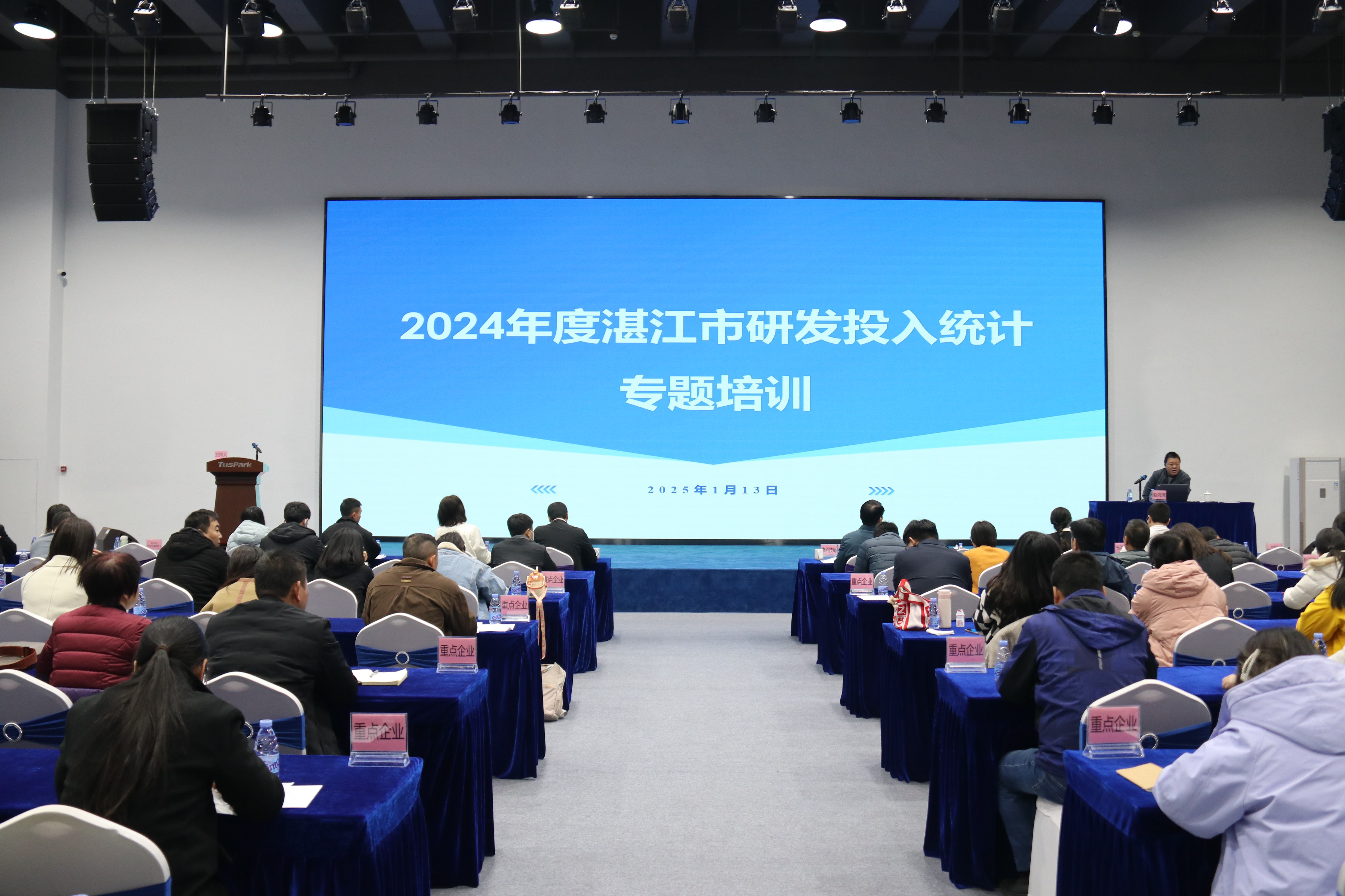 这是湛江市科技局和湛江市统计局联合举办的第三次全社会R&D经费统计培训,共有160人参与本次培训。湛江市科技局规划与政策法规科徐宇霞简要通报上年度研发经费情况;湛江市统计局人口调查队张勇讲解研发创新统计年报知识;岭南师范学院统计系主任赵海清主讲《2024年度湛江市研发投入统计专题培训》,涵盖研发费用归集相关背景信息、研发创新活动统计指标说明和注意要点内容。答疑解惑环节针对研发费优惠政策、研发费归集与专账以及统计与联网直报工作中存在的疑问,与会者积极提出疑问,专家们均以耐心和细致的态度逐一进行了解答。