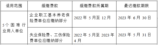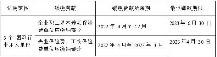 一是调整了餐饮、零售、旅游、民航、公路水路铁路运输等5个困难行业用人单位基本养老保险费缓缴实施期限和补缴时间,即5个困难行业用人单位可申请缓缴2022年4月至2022年 12月的基本养老保险费单位应缴纳部分,最迟于 2023 年6月30日前缴费。 二是明确了农副食品加工业,纺织业,纺织服装、服饰业,造纸和纸制品业,印刷和记录媒介复制业,医药制造业,化学纤维制造业,橡胶和塑料制品业,通用设备制造业,汽车制造 业,铁路、船舶、航空航天和其他运输设备制造业,仪器仪表制造业,社会工作,广播、电视、电影和录音制作业,文化艺术业,体育以及娱乐业等17个困难行业企业,可申请缓缴 2022年6月至2022年12月的基本养老保险费单位应缴纳部分,最迟于2023年6月30日前缴费;可申请缓缴2022年6月至2023年3月的失业保险费和工伤保险费单位应缴纳部分,最迟于2023年4月30日前缴费。上述行业中以单位方式参加社会保险的有雇工的个体工商户以及其他单位参照执行。 三是规定了对受疫情影响较大、生产经营困难的中小微企业实施缓缴政策。受疫情影响严重地区生产经营出现暂时困难的所有中小微企业、以单位方式参保的个体工商户,可申请缓 缴2022年6月至2022年12 月的基本养老保险费单位应缴纳部分,最迟于2023年6月30日前缴费;可申请缓缴2022年6月至2022年12月的失业保险费和工伤保险费单位应缴纳部分,最迟于2023年1月31日前缴费。参加企业职工基本养老保险的事业单位及社会团体、基金会、社会服务机构、律师事务所、会计师事务所等社会组织参照执行。