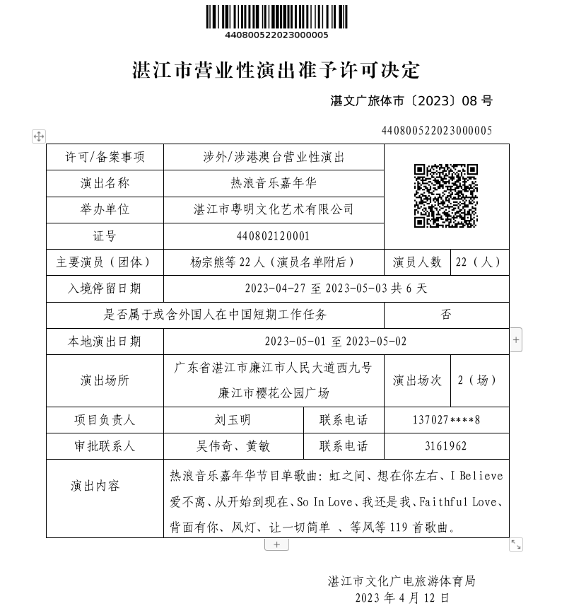湛江市营业性演出准予许可决定(湛文广旅体市〔2023〕08号)