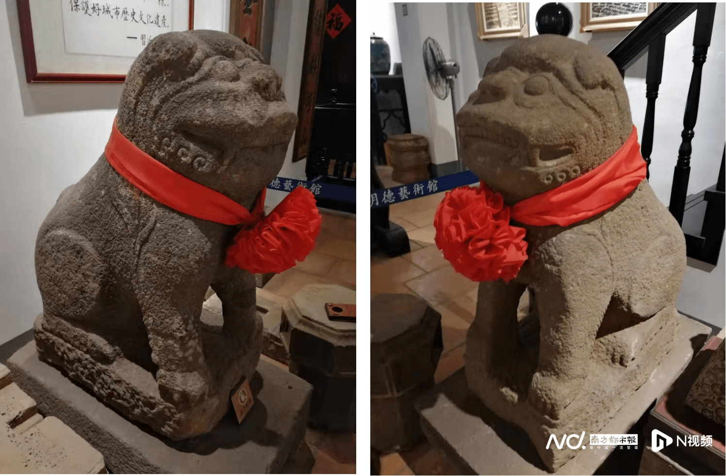 明德艺术馆内,一对石狗端庄稳重、严肃威武,引得在场游客驻足流连。