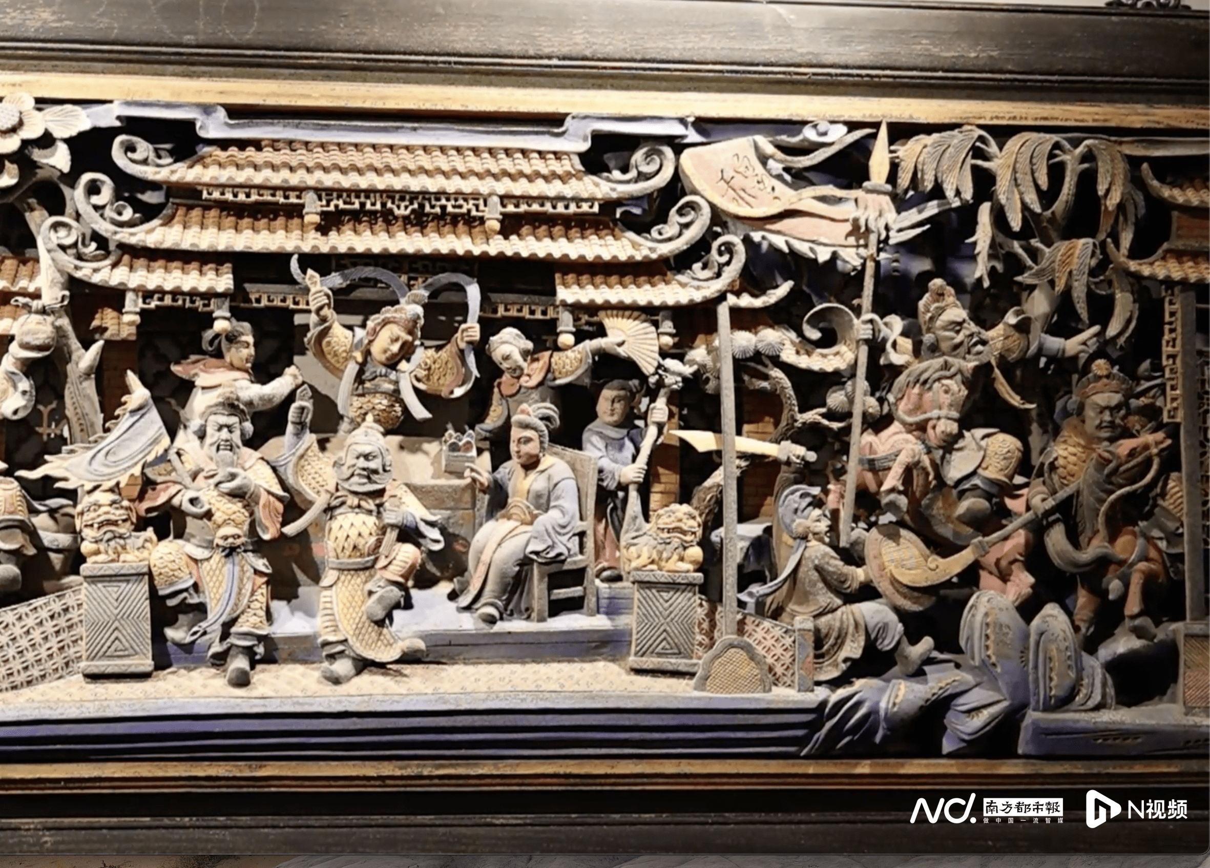 “它的图案寓意为穆桂英挂帅,阐述着民族大爱的精神。”蒋湛明讲解清代木雕背后的美学寓意,这个木雕之所以珍贵,是因为其背后蕴含的工匠精神:“木雕上每个人物的神态、手握的兵器、头饰,甚至每一匹马的动作,都各有不同,又栩栩如生。它还是多层镂空雕刻,这类传统手工制作,现再造难度很高。”