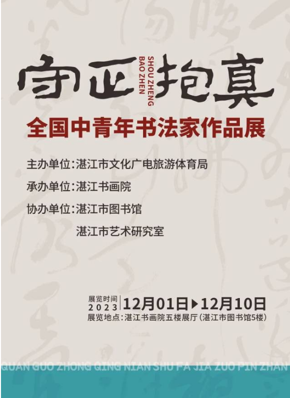为繁荣文艺创作,传承和弘扬书法艺术,引领我市书法创作与研究的良好发展,由湛江市文化广电旅游体育局主办的“守正抱真——全国中青年书法家作品展”于2023年12月1日—10日在湛江书画院举行。