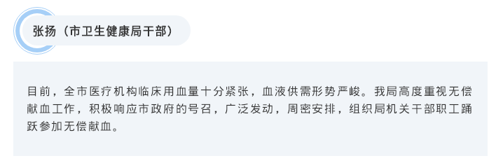 近期,受寒冷天气和新冠病毒感染双重影响,我市临床用血供应紧张。市委、市政府高度重视无偿献血工作,新年伊始,市政府印发了《关于开展全市机关企事业单位“春风献血”活动的通知》,号召机关、企事业单位自2月6日至28日,开展以“春暖献爱心,热血显真情”为主题的献血活动,以缓解供血紧张,满足临床用血需要。