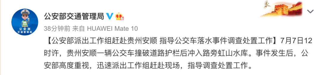 7月7日中午12时许,安顺市西秀区一辆公交车在行驶过程中冲出路边护栏,坠入虹山湖中。