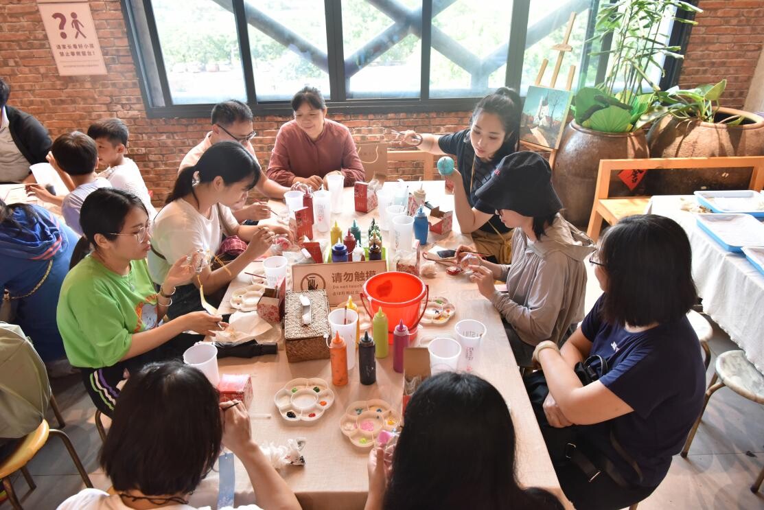 趣味活动结束后,大家参观了足荣村手工制作博物馆,认真观看了雷州竹制品、雷州木雕、雷州傩舞面具、遂溪醒狮道具等,这些手工艺品琳琅满目,美轮美奂。乘电梯上了第四层,进入到规模宏大、种类齐全的手作体验坊。大家在工作人员的指引下,进行风铃描绘、扎染等手工体验,欣赏大大小小、形形色色、精妙绝伦的手作工艺品,流连其间,感叹浩瀚斑斓的雷州半岛民俗文化艺术大观。