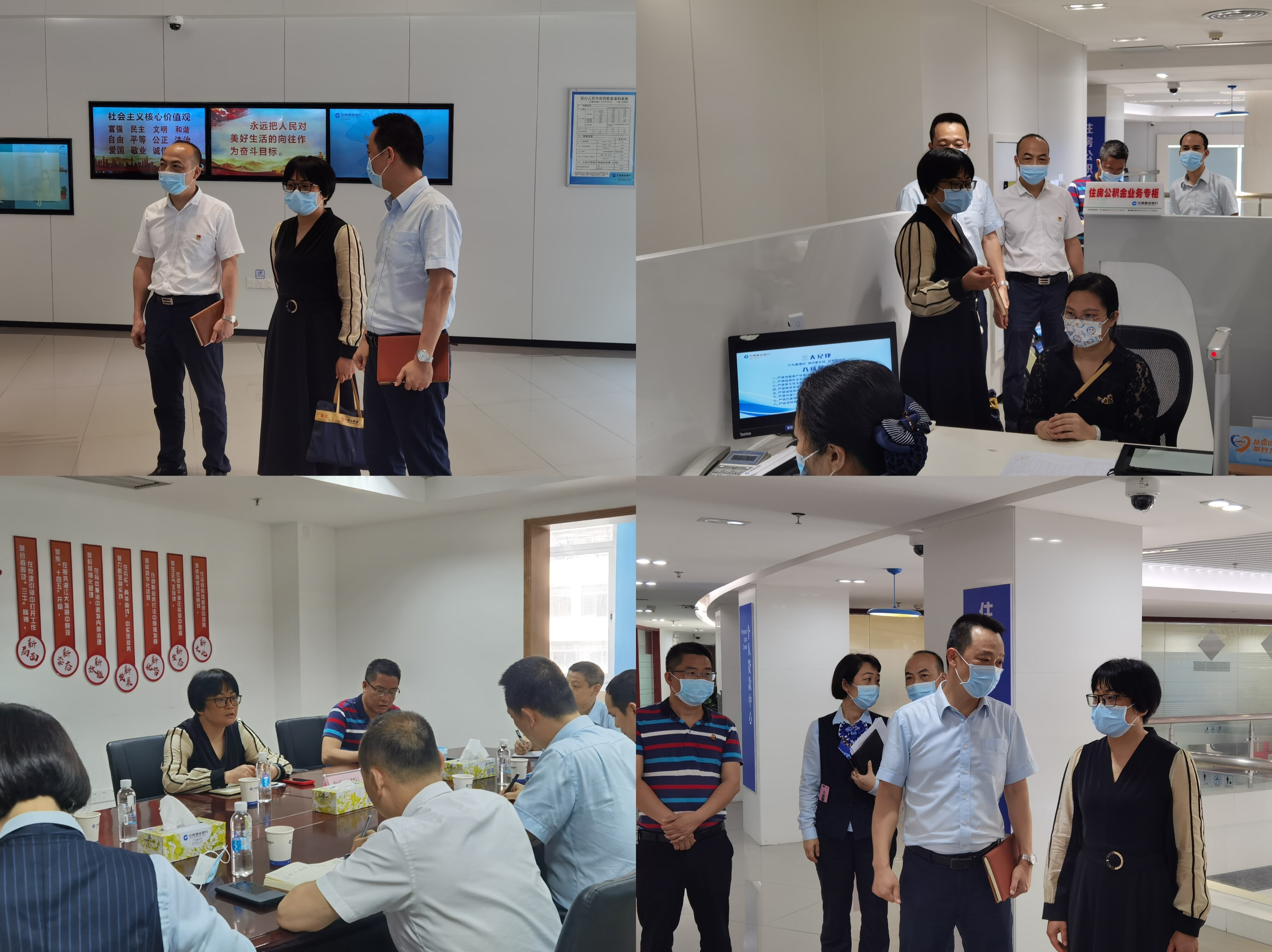 林燕科长一行首先到建行分行营业室察看公积金柜台办公环境,了解各项业务的日常办理与业务操作情况,与经办公积金柜员详细了解情况,随后与建行住金部、营业部召开座谈会。