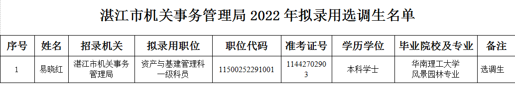 湛江市机关事务管理局2022年拟录用选调生公示(第二批)