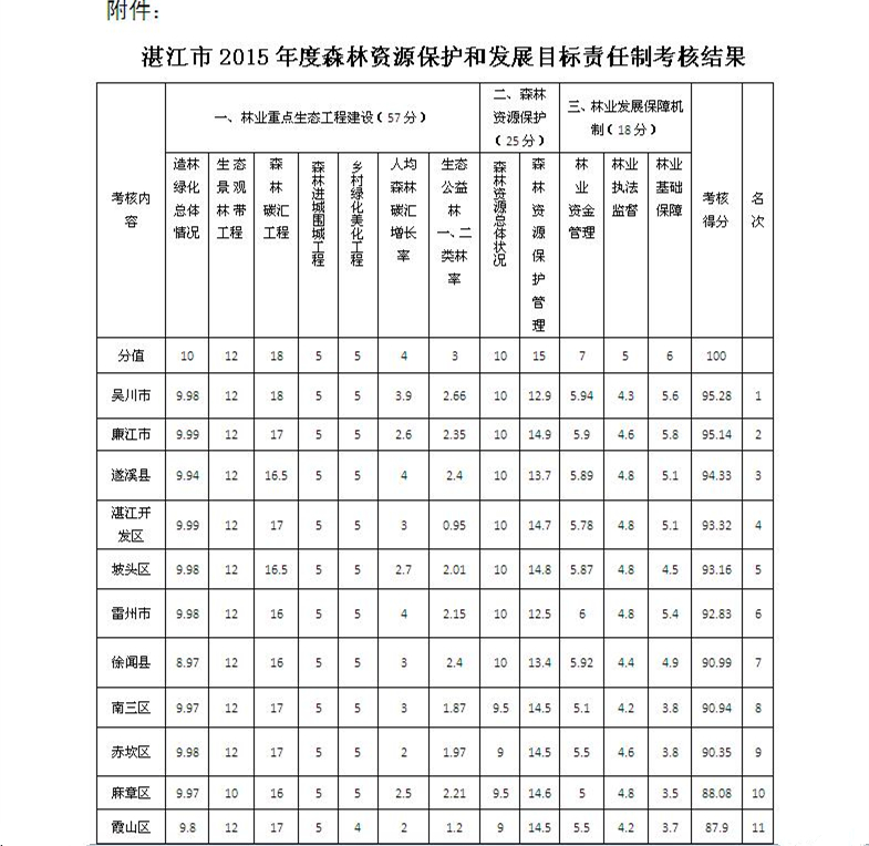按照《广东省森林资源保护和发展目标责任制考核办法》、《广东省森林资源保护和发展目标责任制考核评分操作细则》和《91吃瓜 办公室关于开展2015年度全市森林资源保护和发展目标责任制考核工作的通知》(湛府办函〔2015〕126号),我市开展了2015年度森林资源保护和发展目标责任制考核。经市人民政府同意,现将考核结果通报如下: