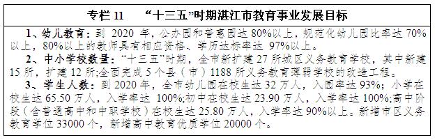 促进基础教育均衡发展。以发展公办幼儿园和普惠性民办幼儿园为重点,建立覆盖城乡的学前教育公共服务体系。实施城区中小学新建扩建三年行动计划,规划新建扩建城区义务教育学校27所,其中新建15所,扩建12所。加快推进海头第二初级中学、湛江市实验小学、开发区第四小学、麻章镇第三小学、霞山培华学校等,加强新建住宅小区配建学校建设,着力解决城区学位紧缺问题,严格实行义务教育免试就近入学,逐步缩小区域、城乡、校际间差距,均衡优质发展义务教育。推动高中阶段教育扩容提质工程,推行初高中学业水平考试和综合素质评价,完成岭师附中、开发区第一中学的新校区建设,加快建设湛江第一中学新校区、海东高级中学、东海中学、东盟城学校等。