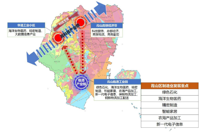 以霞山临港工业园为发展核心,依托湛江港港口优势,重点发展绿色石化、海洋生物医药、精密制造、智能家居、农海产品加工、新一代电子信息等产业,同时大力发展保税物流加工、钢铁物流加工配送等临港配套产业,打造现代临港产业集聚;以数据中心、5G、云计算、工业互联网等新型基础设施为发展依托,打造大数据信息产业园,为湛江市制造业发展提供数据支撑平台。加快推动湛江综合保税区高水平开放高质量发展,发挥综合保税区的辐射带动作用,通过临港产业与高新技术产业的联动发展,打造霞山区都市型工业体系,从而形成港产城联动的发展格局。