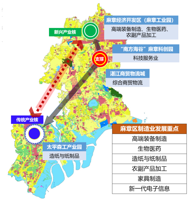 重点发展高端装备制造、生物医药、造纸与纸制品、农副产品加工、家具制造、新一代电子信息等产业;以太平现代森工产业园为依托,发展造纸与纸制品等传统资源型优势产业,构建粤西地区一流的现代林业综合产业园,打造现代林业的“先行区”和“示范区”;以麻章经济技术开发区(麻章工业园)为依托,发展高端装备制造、生物医药、农副产品加工等产业。加快建设粤西数谷大数据产业园,发展5G、工业互联网、云计算、人工智能等新一代电子信息产业。
