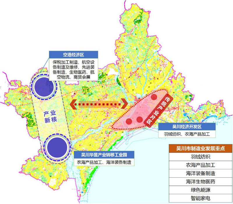 空港经济区主要布局发展保税加工制造、航空设备制造及维修、先进装备制造、生物医药、航空物流、商贸会展等产业;吴川产业转移工业园发展农海产品加工、海洋装备制造等产业;吴川经济开发区重点发展羽绒纺织、农海产品加工业等产业。