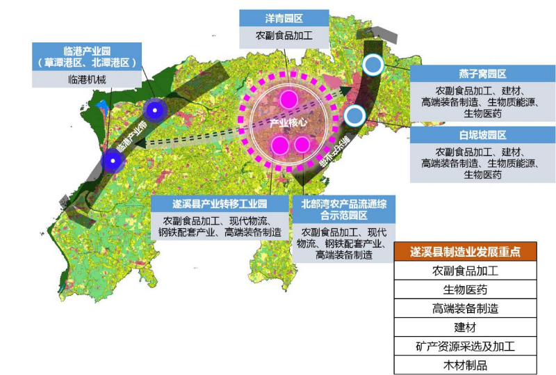 以遂溪产业转移工业园、北部湾农产品流通综合示范园区为主导,重点发展农副食品加工、现代物流、钢铁配套产业、高端装备制造等。以燕子窝园区、白坭坡园区为主的东部产业带,重点发展农副食品加工、建材、高端装备制造、生物质能源、生物医药等产业。谋划建设临港产业园,依托港口优势,发展临港产业。