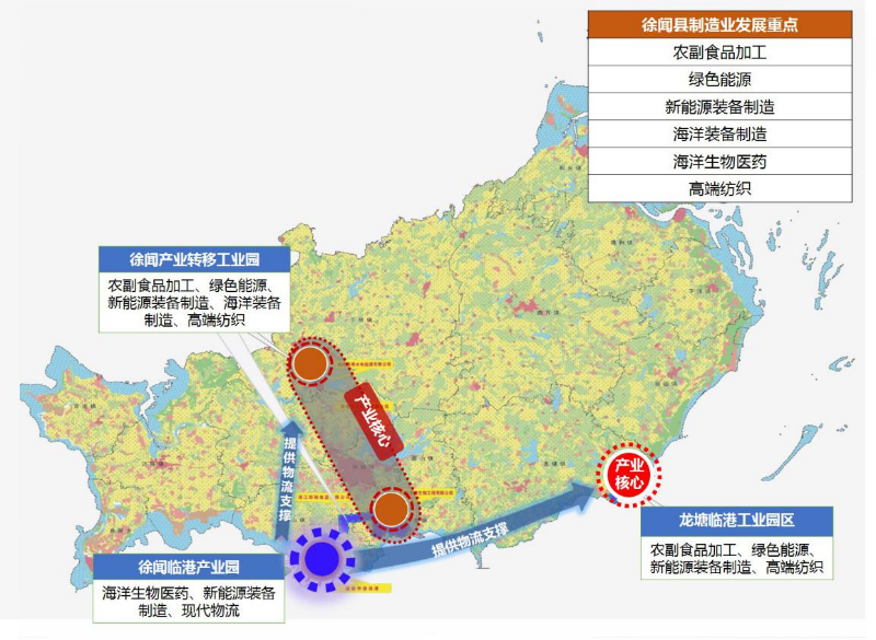 以徐闻产业转移工业园和龙塘临港工业园为依托,发展农副食品加工、绿色能源、新能源装备制造、海洋装备制造、高端纺织;徐闻临港产业园重点发展海洋生物医药、新能源装备制造、现代物流等产业。