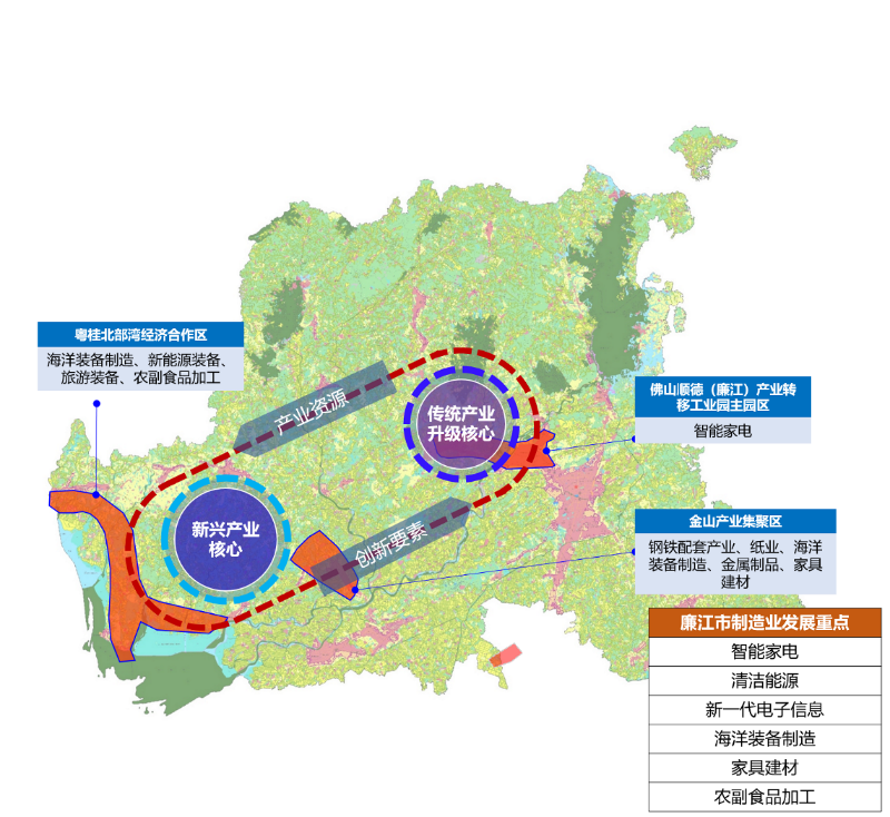 佛山顺德(廉江)产业转移工业园重点发展智能家电等产业,打造百亿级家电产业集群;金山产业集聚区承接钢铁配套产业,发展纸业、海洋装备制造、金属制品、家具建材等产业;沙塘产业聚集区发展绿色能源、机械装备等产业。