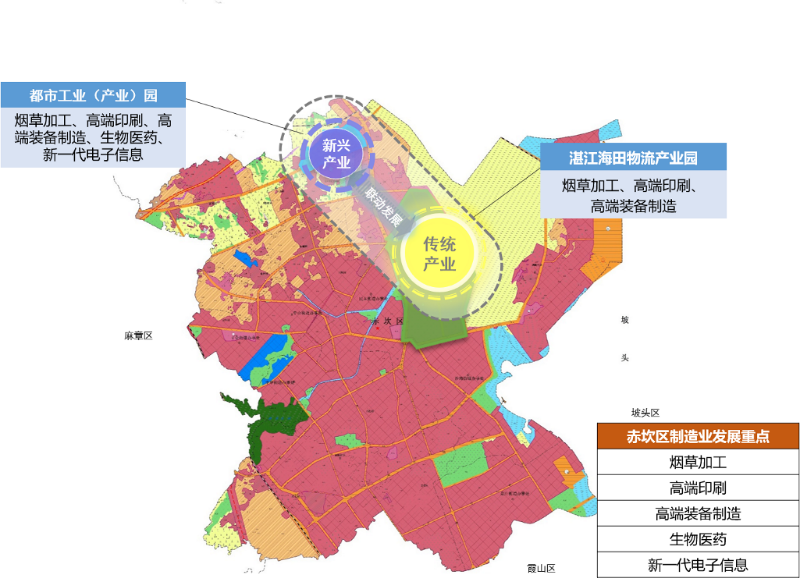 全力打造赤坎区都市产业园。通过规划引领,引进和培育一批符合申报条件、成长性能好、有发展潜力的创新型企业,重点发展烟草加工、高端印刷、高端装备制造、生物医药、新一代电子信息等产业,力争打造成为湛江乃至粤西地区的都市工业示范园区。合力打造“赤坎区高新产业集聚区”,加快促进海田物流产业园向高新产业集聚区、创新创业孵化基地转型升级。重点招引一批软件研发和信息服务、数字创意、电子信息及服务型制造业等产业的高附加值、高科技含量企业进驻,推动工业互联网、物联网、区块链、5G智能、云计算等新一代信息技术和实体经济融合发展。