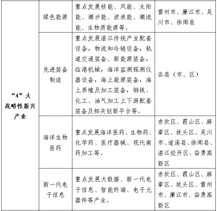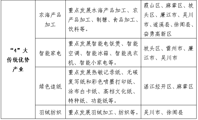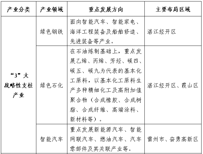 抓住海南自贸港建设的重大机遇,支持建设雷州经济开发区,着力推进“一区三园、一中心三基地”建设,重点发展智能汽车、智能家电、高端装备制造、新一代电子信息、先进材料、绿色能源等产业。