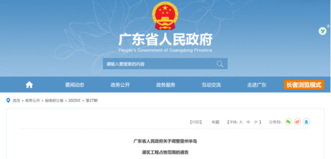 2025年9月30日,广东省人民政府发布了关于调整雷州半岛灌区工程占地范围的通告。