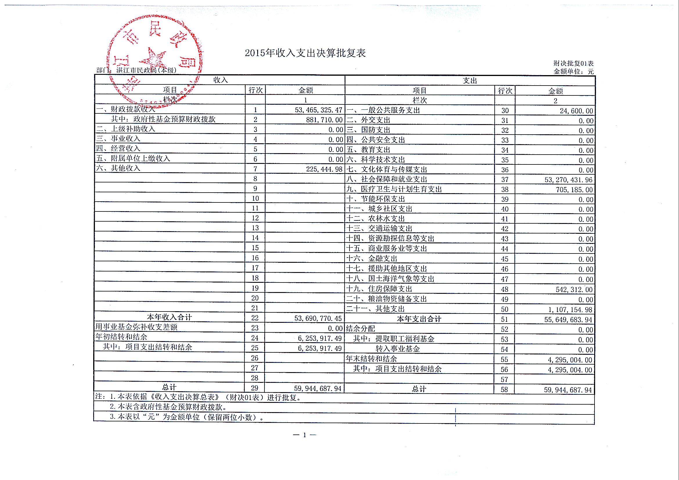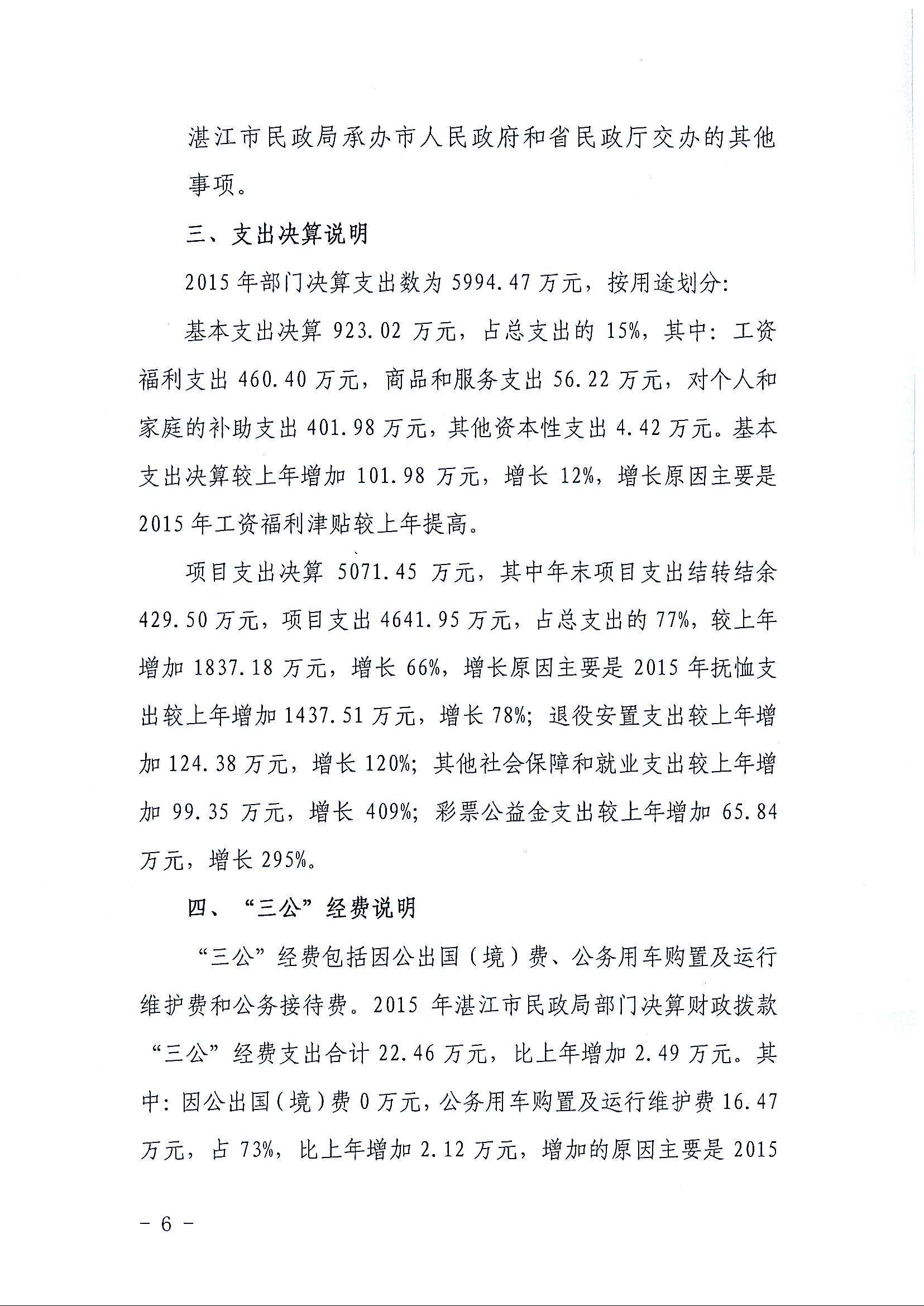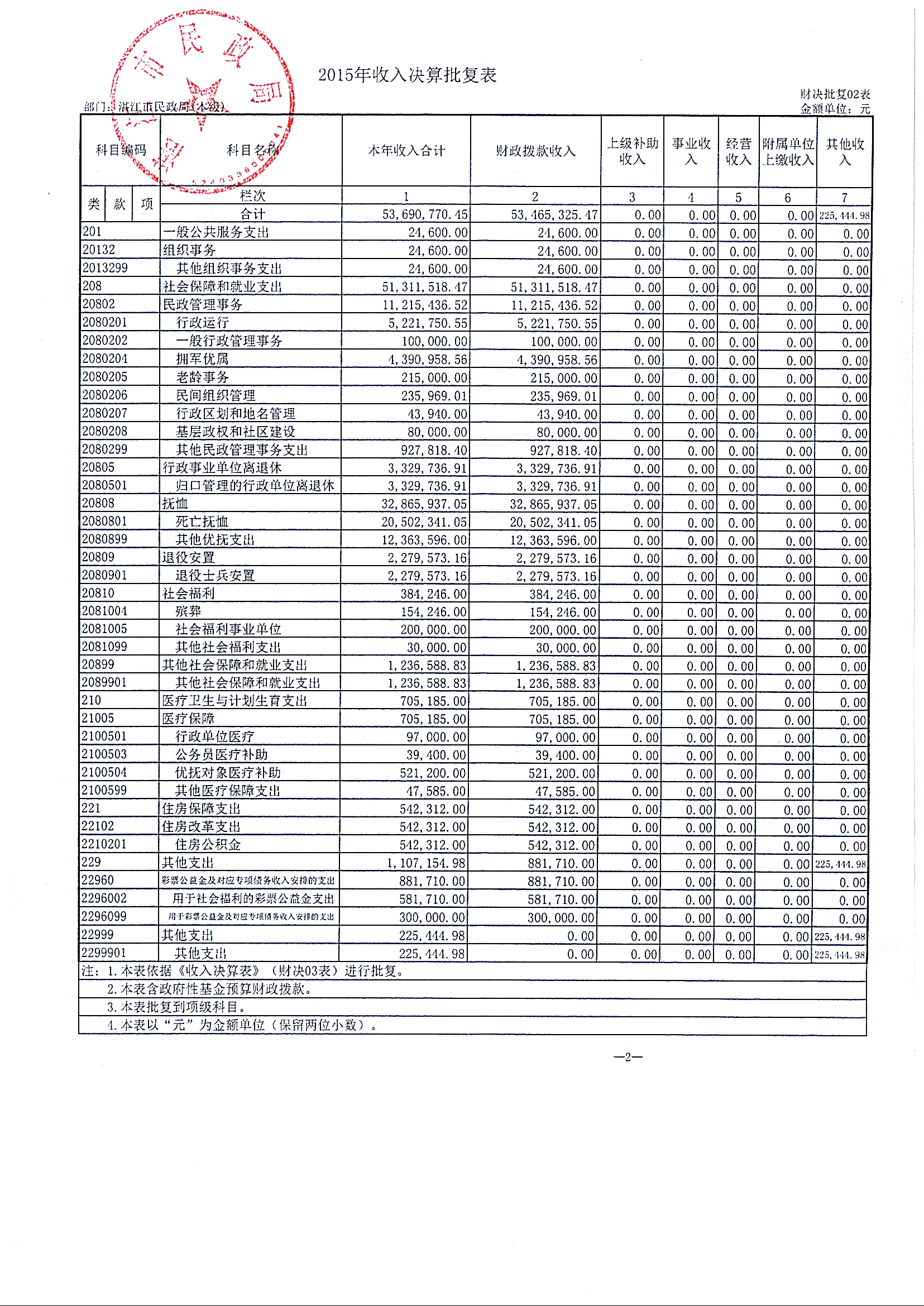 补充公开2015年部门决算情况说明及湛江市民政局(本级)2015年决算批复表