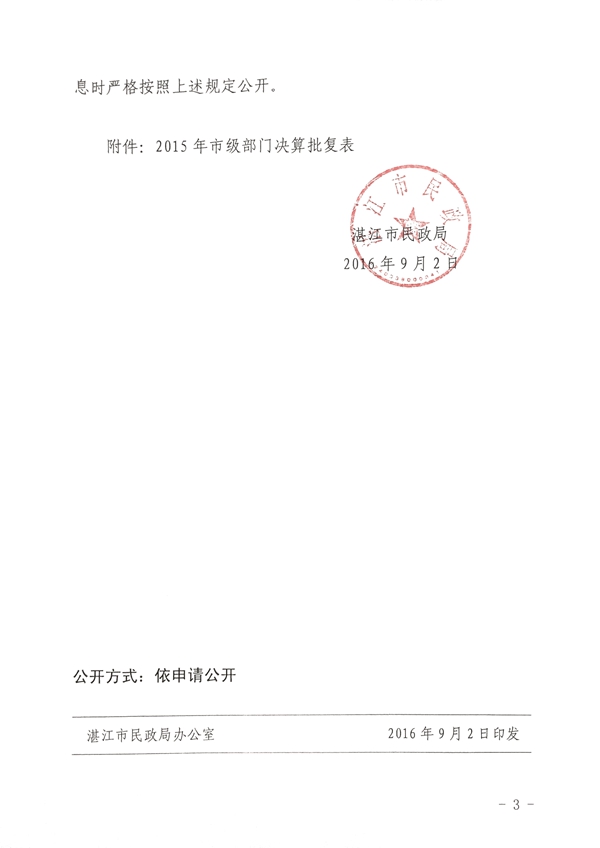 湛江市海滨军队离休退休干部休养所2015年市级部门决算批复