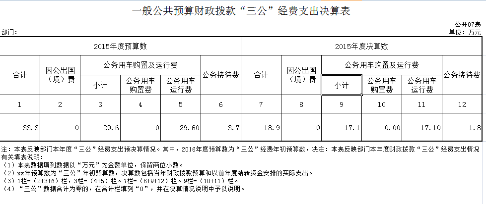 2015年“三公”经费财政拨款支出决算中,因公出国(境)费没有;公务用车购置及运行维护费支出 17.1 万元,占90.48 %;公务接待费支出1.8 万元,占9.52 %。具体情况如下: