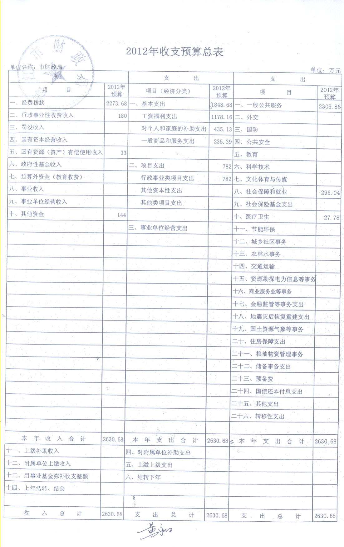 附件:2012年收支预算总表