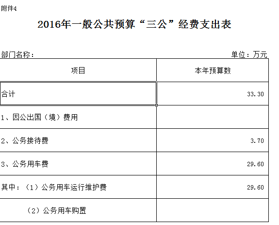 2016 年本部门“三公”经费预算安排支出33.3万余。与上年保持不变主要原因………其中:因公出国(境)费今年预算没支出0万元,与上年保持不变;主要原因…….公务用车购置及运行预算支出费29.6万元,与上年保持不变;主要原因是严格执行上级“只减不增”规定,加大管理力度,增强节约;公务接待费3.6 万元, 与上年保持不变;主要原因是:贯彻落实八项规定,规定按照理性节约有关要求,严控公务接待开支,逐步减少“三公”经费开支