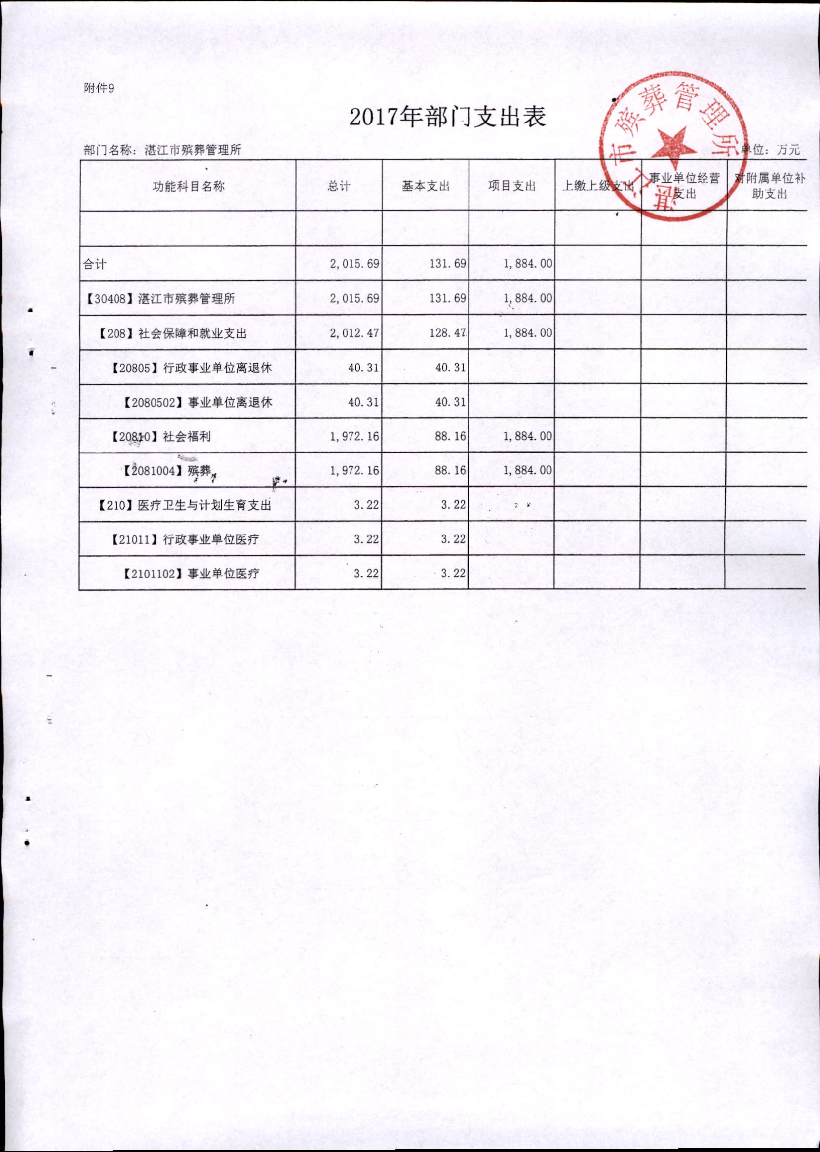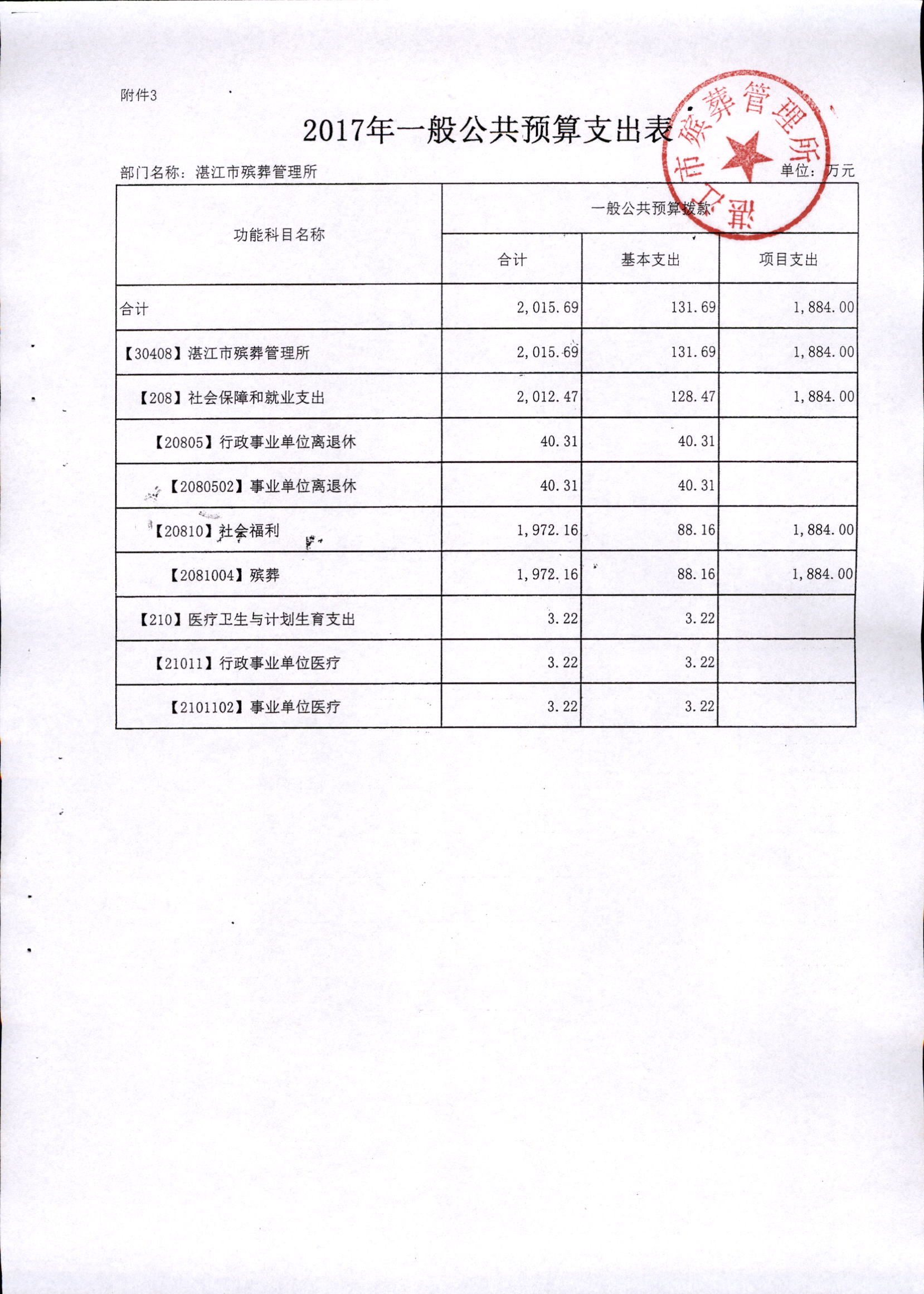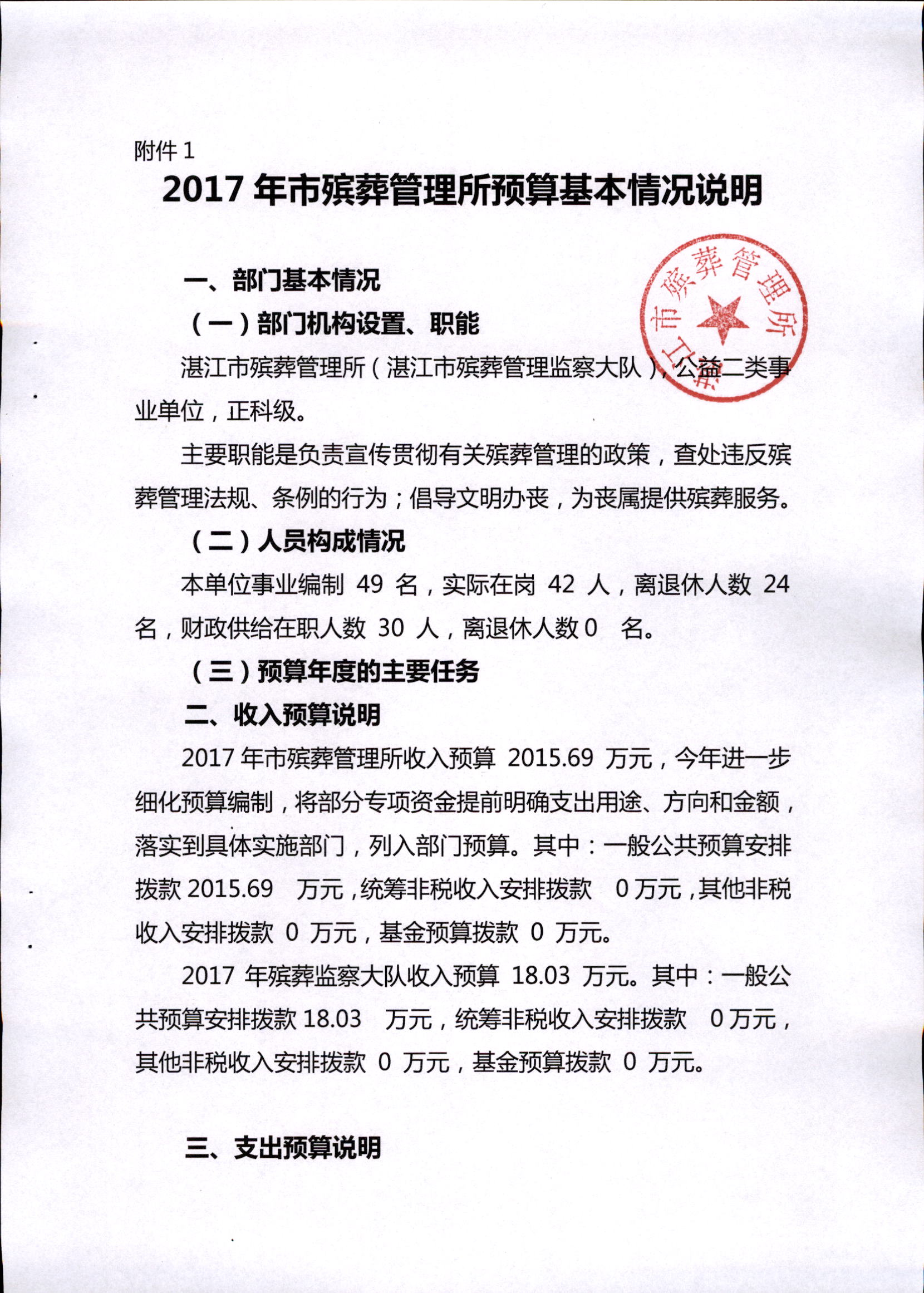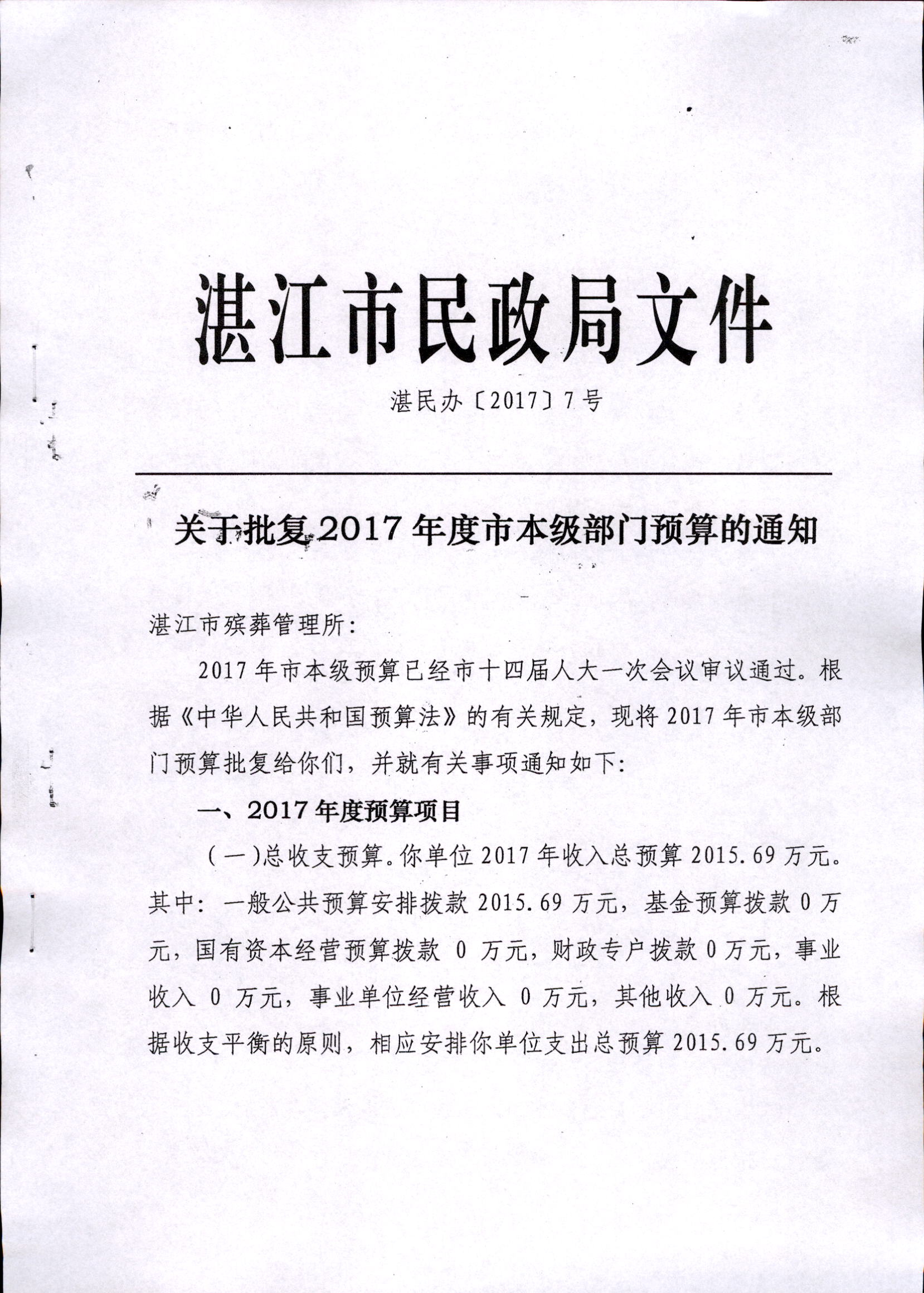 湛江市殡葬管理所2017年市本级部门预算批复
