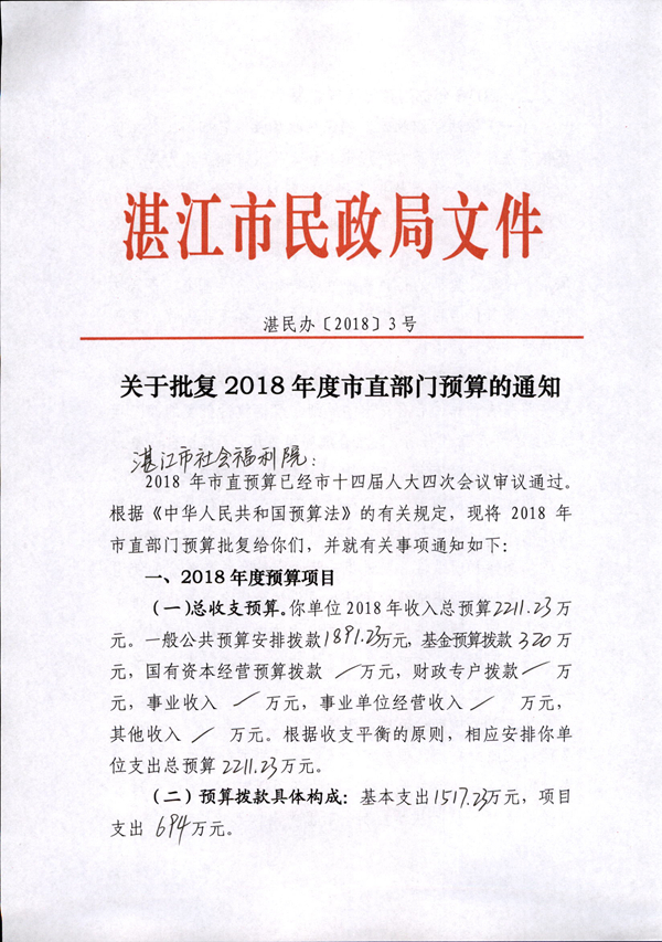 关于批复2018年度市直部门预算的通知(湛江市福利院)