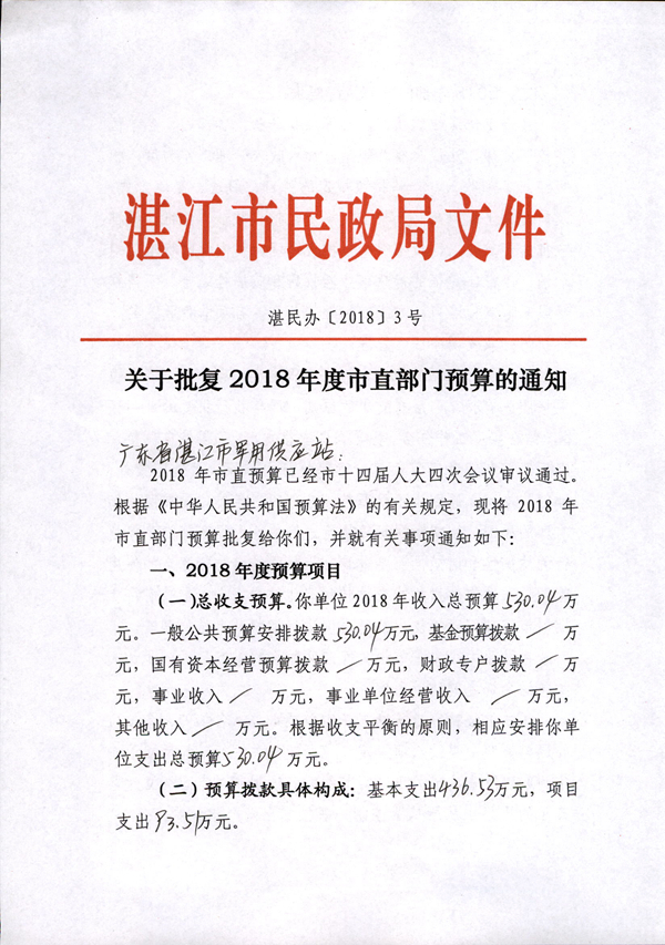 关于批复2018年度市直部门预算的通知(广东省湛江市军用供应站)