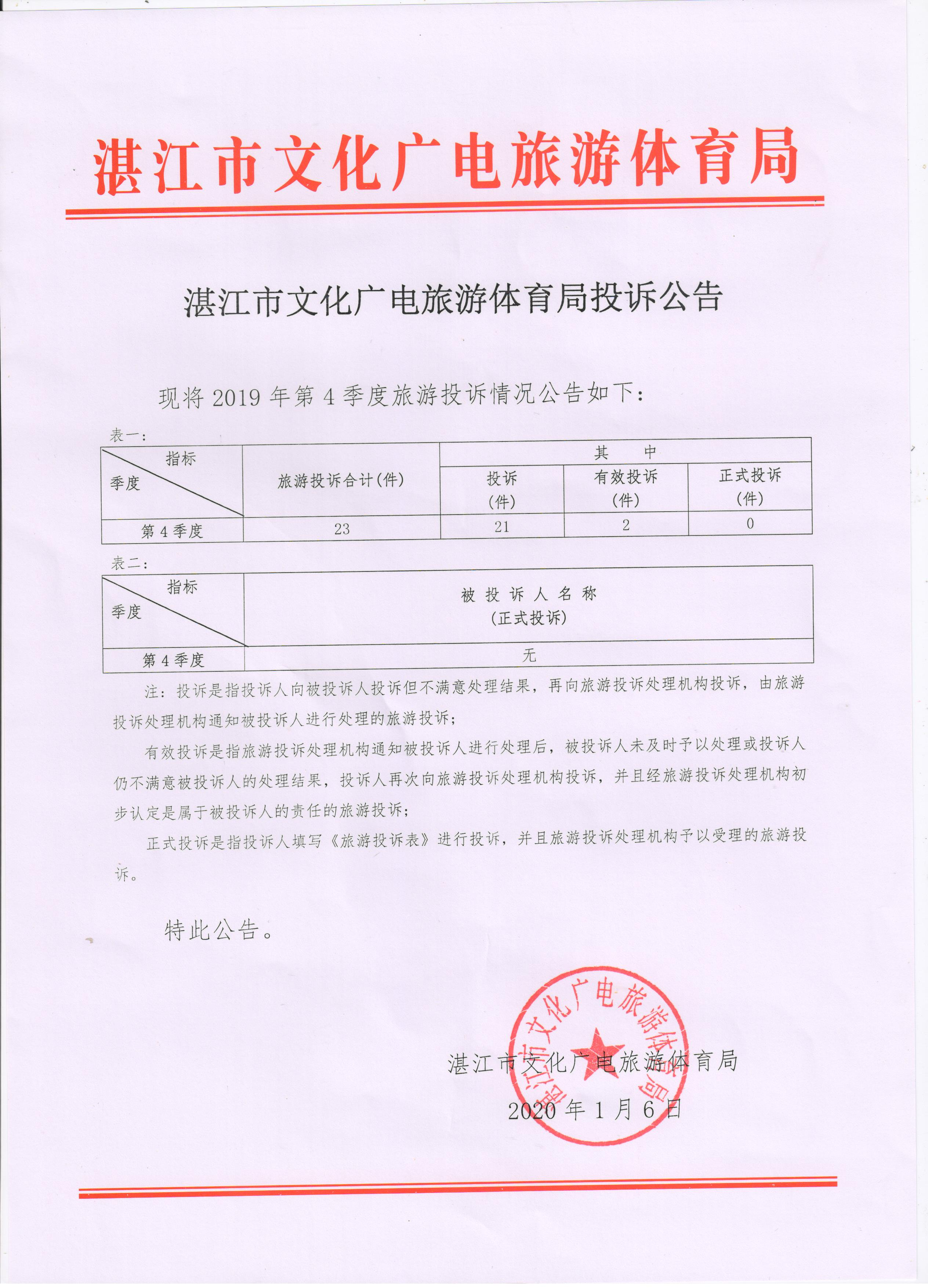 湛江市旅游投诉公告(第四季度)