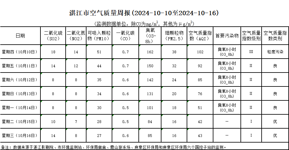 湛江市空气质量周报(2024-10-10至2024-10-16)