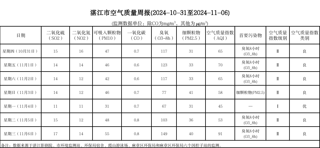湛江市空气质量周报(2024-10-31至2024-11-06)