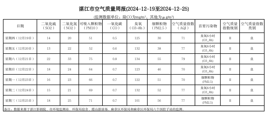 湛江市空气质量周报(2024-12-19至2024-12-25)