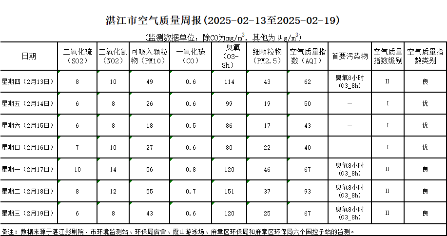 湛江市空气质量周报(2025-02-13至2025-02-19)