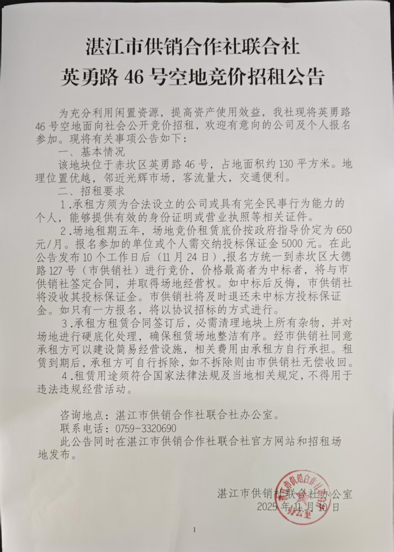 湛江市赤坎区英勇路46号场地经营权公开竞价招租公告