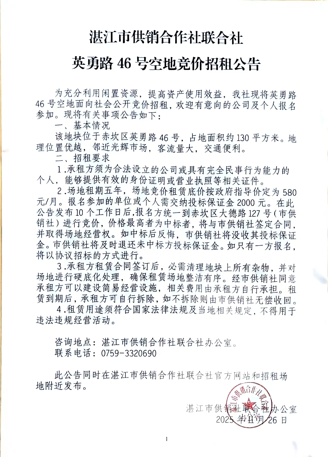 湛江市赤坎区英勇路46号场地经营权公开竞价招租公告
