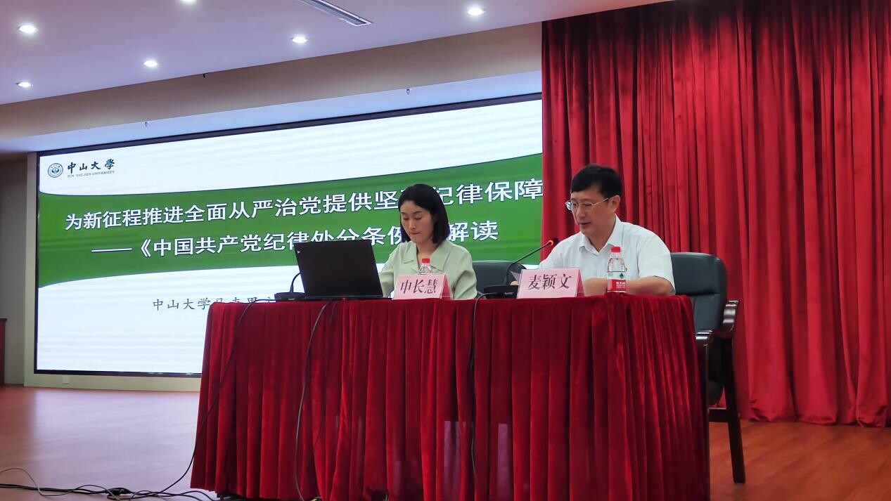 为深入学习贯彻习近平总书记关于党纪学习教育的重要讲话和重要指示精神,不断强化市属企业党员干部的纪律观念和规矩意识,6月18日上午,中山大学马克思主义学院联合湛江市国资委开展《中国共产党纪律处分条例》专题学习宣讲会,中山大学马克思主义学院申长慧助理教授作《条例》解读辅导,湛江市国资委党委委员、副主任麦颖文主持,市国资委全体党员干部及400名市直属企业党员干部参加学习。