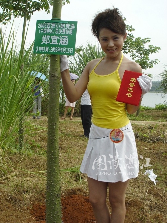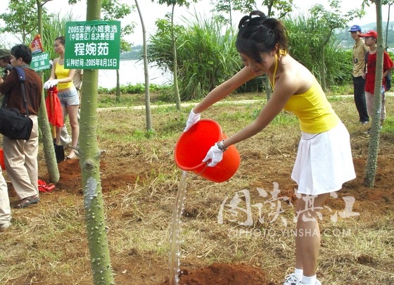 当天上午,在2005年亚洲小姐(中国赛区)进入总决赛的18名候选佳丽前来湖光岩,倾情支持湖光岩申报世界地质公园活动上。18名佳丽在赵平副市长、黄坤伟局长等领导的指引下,佳丽们为“申世”送上一份美好的祝愿,来到美人林区,亲手种下18棵美人树,为支持湖光岩“申世”增添一片绿。亚姐们在认钟树木签字仪式后,争先恐后地培土、浇水,接受媒体采访,大家都很有信心地表示,有机会一定将再次来湛江湖光岩风景区看看自己的树木长势如何。她们的举动,吸引了当天近万人涌向湖光岩的眼球。(图/文 王志强 李满青 编辑/古 韵)