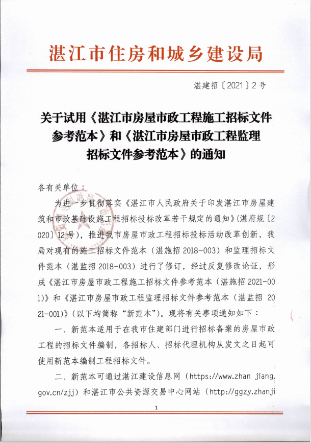 关于试用《湛江市房屋市政工程施工招标文件参考范本》和《湛江市房屋市政工程监理招标文件参考范本》的通知
