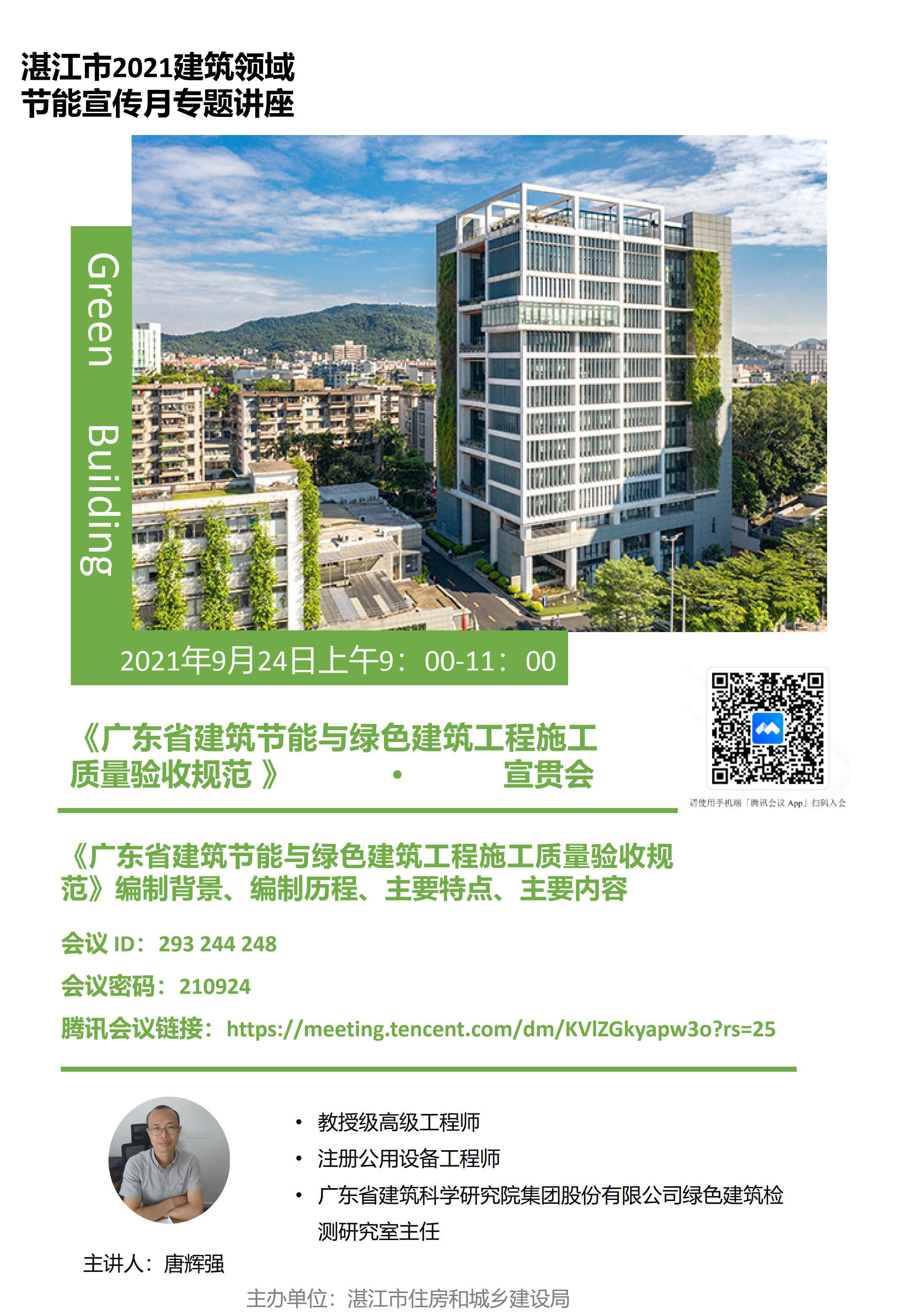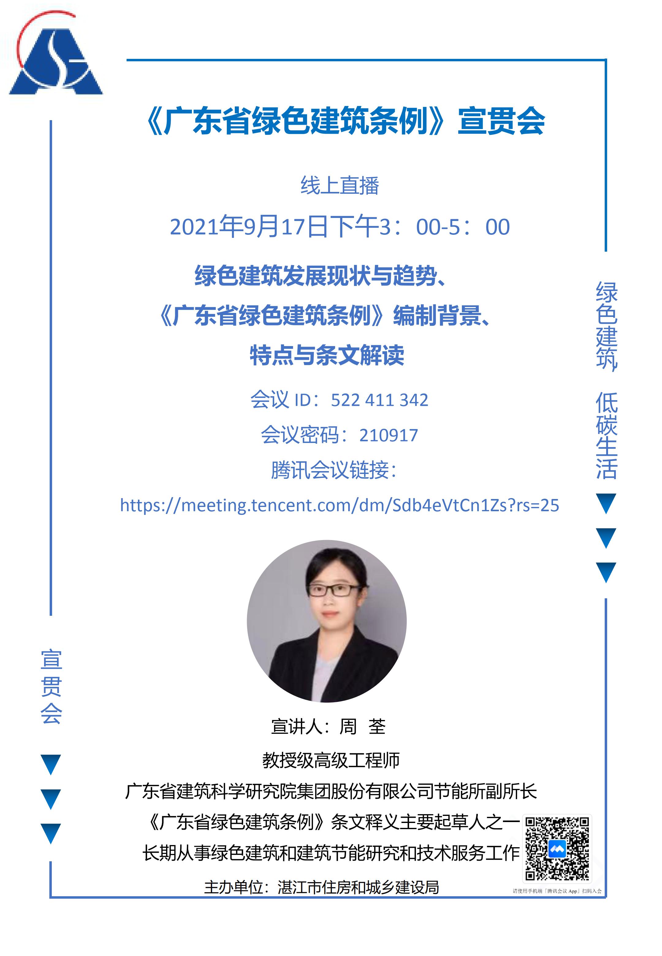 宣贯内容:绿色建筑发展现状与趋势、《广东省绿色建筑条例》编制背景、特点与条文解读。