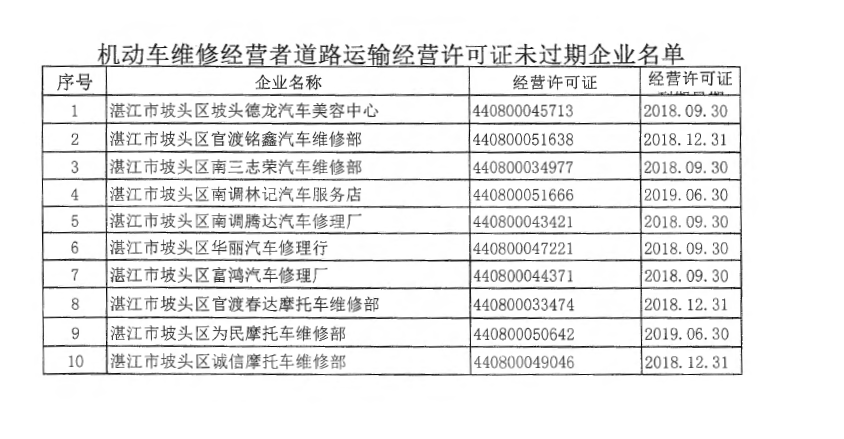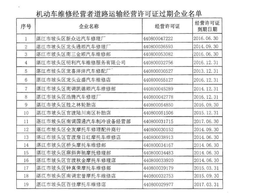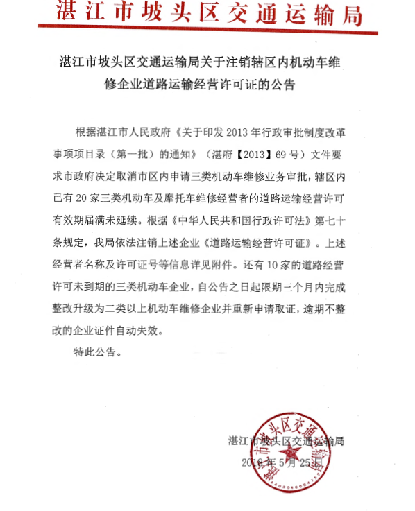 湛江市坡头区交通运输局关于注销辖区内机动车维修企业道路运输经营许可证的公告