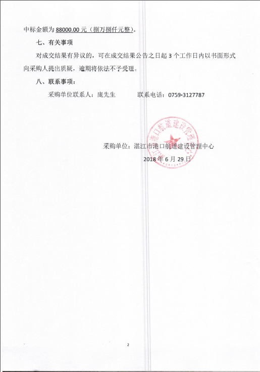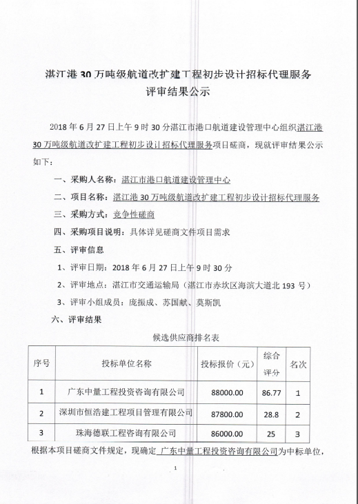 湛江港30万吨级航道改扩建工程初步设计招标代理服务评审结果公示